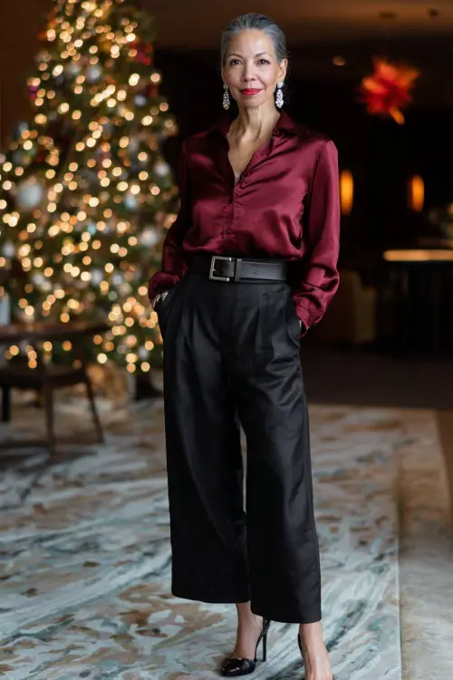 A ruby red satin button-down blouse is a beautiful way to bring holiday color into your outfit while staying classy.