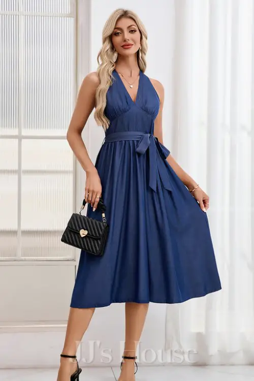 22. A halter-style navy midi dress tied at the waist is perfect for summer lunches or casual social outings.