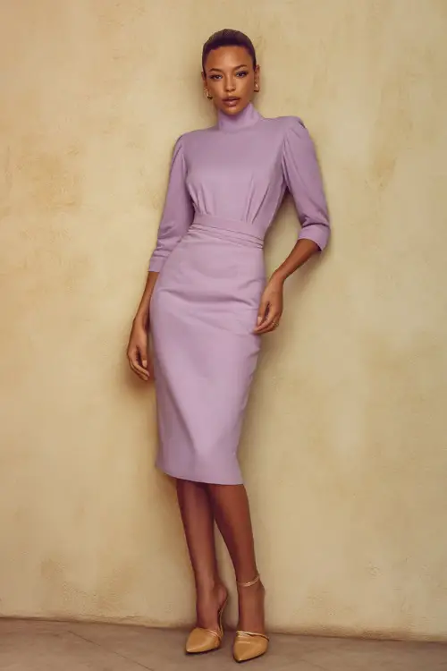 17. If you’re after something a little more structured, a fitted lavender sheath dress with long sleeves and a high neckline delivers sophistication and style.